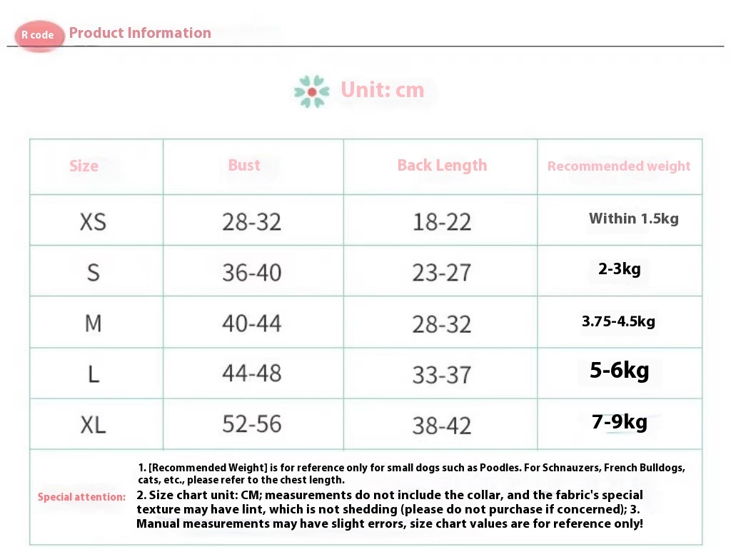 Size: XS chest circumference 30cm, back length 20cm, inner 1.50kg, S chest circumference 38cm, back length 25cm, 2.00 kg-3.00 kg, M chest circumference 42cm, back length 30cm, 3.50 kg-4.50 kg, L chest circumference 46cm, back length 35cm, 5.00 kg-6.00 kg, XL chest circumference 54cm, back length 40cm, 7.00 kg-9.00 kg